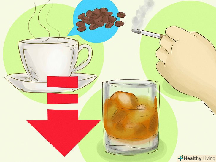 Обмежте споживання кофеїну, алкоголю та нікотину.кофеїн є збудливим засобом і допомагає вам відчувати себе бадьоріше і енергійніше, але крім цього, ще й прискорює реакцію організму на стрес. Якщо ви змушені вживати кофеїн, намагайтеся не пити більше 200 мг на день (близько двох чашок свіжозвареної кави). Не вживайте кофеїн після п'ятої години вечора, щоб уникнути порушень режиму сну.[32]- Збуджуючі засоби також порушують ваш режим сну.[33]