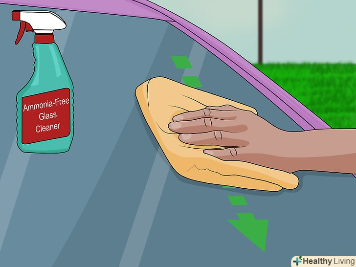 РетельноВідмийте Вітрове скло миючим засобом для скла.Щедро нанесіть на вітрове скло засіб для чищення скла, яке не містить в собі аміак. Потім протріть його чистою м'якою ганчіркою, що не залишає після себе ворсинок, наприклад, з мікрофібри. Рухайтеся зверху вниз і працюйте до тих пір, поки скло не стане чистим.- Засіб для чищення скла можна замінити нерозчиненим білим винним оцтом. Налийте його в пульверизатор і використовуйте точно так же, як і засіб для чищення скла. Постарайтеся зробити так, щоб оцет не потрапив на пофарбовані деталі машини.[2]