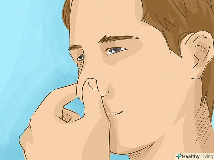 2. Затисніть ніс.Так як слізні протоки йдуть від бічних частин носа до відповідних отворів нижніх повік, перетискання перенісся з боків при закритих очах може заблокувати сльози (даний метод найкраще діє до початку сльозотечі).[2]