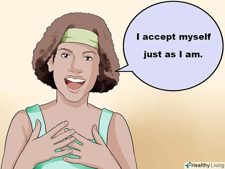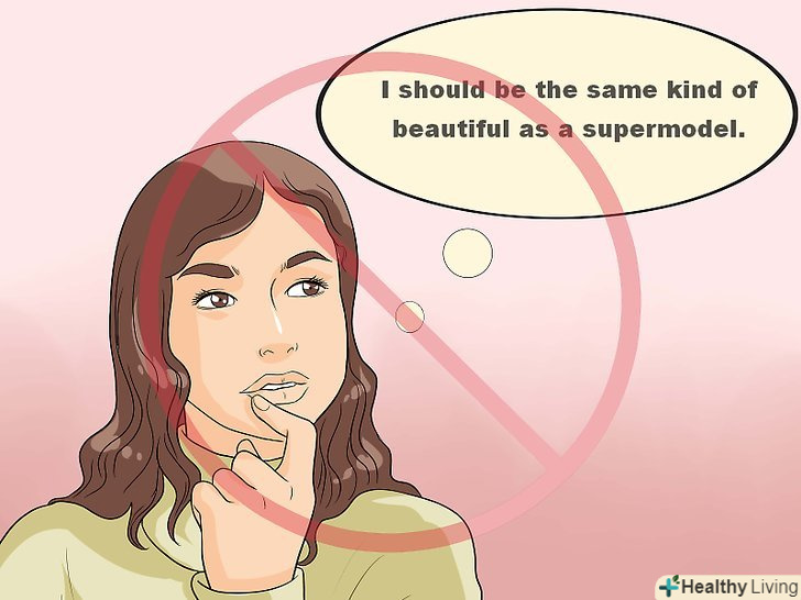 Припиніть нагромаджувати себе словом»повинен".Психолог Клейтон Барбо пояснює в своєму дослідженні, що трапляється, коли ви починаєте думати про себе, використовуючи термін «повинен»: «я повинна стати красивою, як супермодель» або «я повинна мати другий розмір» або «у мене повинен бути інший колір шкіри/волосся/очей/зріст/вага та інше».[13] використання слова» повинен " проти нас самих робить нас винними і сумними.- Наприклад, люди можуть відчувати себе непривабливими, коли починають порівнювати себе з недосяжними стандартами акторів або супермоделей. Дуже легко повірити в те, що ми «повинні» виглядати як красиві люди з фільмів і журналів. Постарайтеся запам'ятати, що досить часто навіть моделі в рекламах і журналах не виглядають так, як їх показують. Для зміни зовнішнього вигляду часто використовують програму Photoshop.[14]