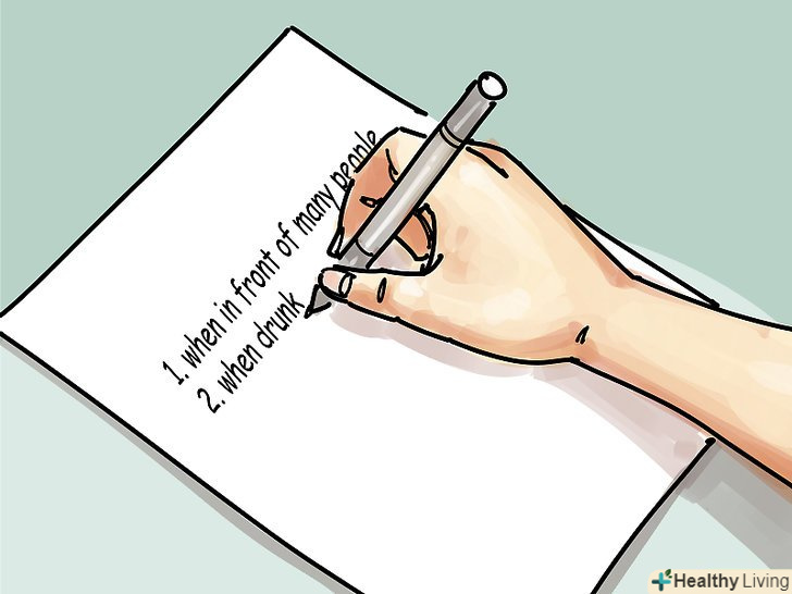 Перш за все, постарайтеся попередити почервоніння, якщо це, звичайно, можливо. Спочатку визначте, коли ви червонієте. Це відбувається, коли ви гніваєтеся або нервуєте? Або коли ви дивитеся на когось, або думаєте про нього? Або коли на Вас всі звертають увагу? Не обов'язково намагатися уникнути того, що змушує вас червоніти, просто постарайтеся привчити своє тіло вірити, що немає ніяких причин червоніти, коли такий момент настає. Це перший крок у боротьбі з червоністю.- Складіть список ситуацій, в яких ви червоніли, особливо якщо це було пов'язано зі спілкуванням. Запишіть, який був результат цієї ситуації. Над вами жартували? Це помітили інші? У більшості випадків виховані люди не вважають червоність проблемою і не акцентують на ній увагу. А чому вони повинні це робити? Адже це неможливо контролювати. Постарайтеся усвідомити, що почервоніння не завжди має таке важливе значення, як ви думаєте.