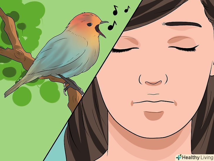 Зосередьтеся на тому, що ви чуєте з закритими очима.звертайте увагу на кожен звук і намагайтеся визначити відстань, яку він пройшов до вас. Навчіться виділяти різні звуки на зразок співу птахів. Спробуйте стежити за двома різними звуками одночасно.[4]- Слухайте музику в навушниках. Щоб ускладнити завдання, використовуйте два комплекти навушників з різними піснями для кожного вуха. Спробуйте вловити обидва мотиву.