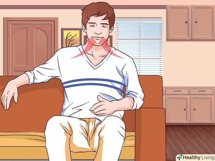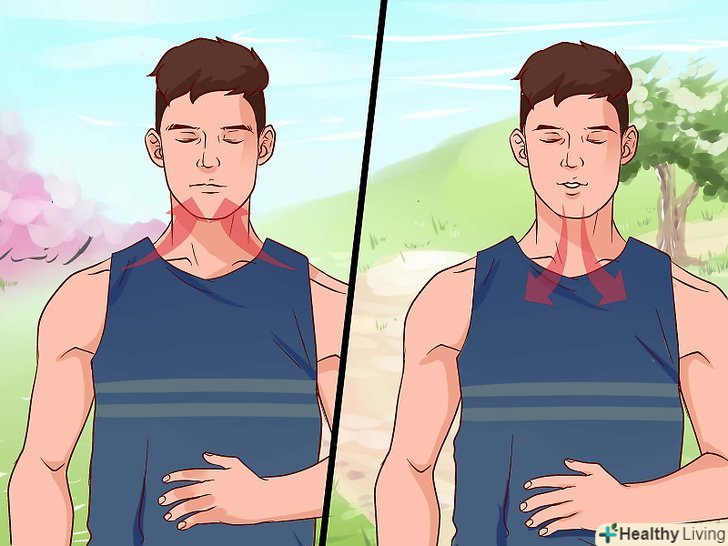 Використовуйте метод глибокого дихання.у моменти тривоги або страху людина схильна дихати занадто швидко і перенасичувати легені киснем. Гіпервентиляція підсилює почуття страху і тривоги, тим самим погіршуючи ситуацію. Глибоке дихання дозволяє розслабитися і знизити напругу, тим самим послаблюючи почуття тривоги. Виконайте наступні дії, щоб застосовувати метод глибокого дихання:[19]- Зручно розташуєтеся сидячи або стоячи і тримайте спину прямо. Помістіть одну руку на живіт, а другу на грудну клітку.