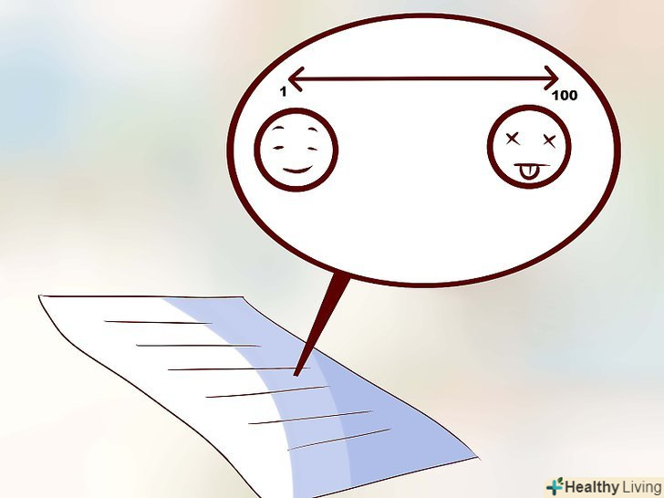 Створіть і застосовуйте шкалу оцінки рівня тривоги.скористайтеся шкалою, в якій 0 буде відповідати повній розслабленості, а 100 — максимальному рівню страху, дискомфорту і тривоги.[23] це дуже корисний інструмент для спостережень за поступовим зниженням рівня вашої напруги.[24]- Шкала оцінки рівня тривоги також дозволить визначити, коли пора переходити до наступного кроку вашого плану.