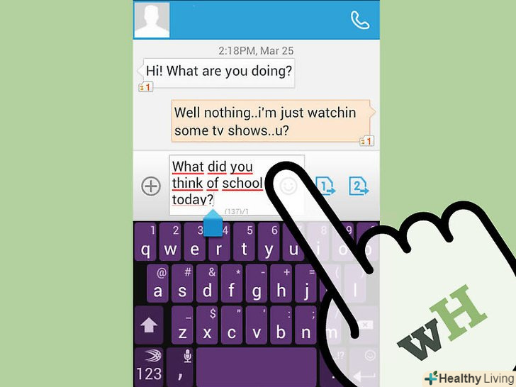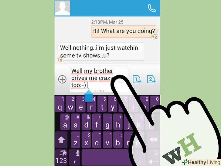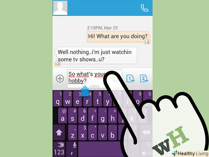 Надішліть своє перше повідомлення.розмову можна почати, просто запитавши: "що робиш?"або" чим займаєшся?»- Якщо він відповість, що дивиться телевізор, слухає музику або грає в гру, тоді запитайте, що саме він дивиться, слухає або у що грає. Який би відповідь ви не отримали, ви завжди повинні бути готові задати уточнююче питання, щоб розмова не переривався.