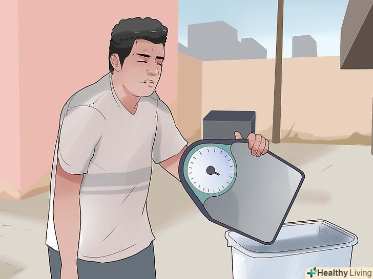 Позбавтеся від ваг.це може здатися вам неправильним, однак щоб перестати переживати і засмучуватися через свою вагу, слід заховати ваги. Зважування - це лише один із способів (і не найточніший) відстежувати прогрес. Крім того, якщо ви стаєте на ваги щоранку і лаєте себе через те, що вага залишається на місці або йде вгору, ви нервуєте більше, ніж воно того заслуговує.[8]- Вага може вводити вас в оману, оскільки 70 кілограмів у людини зростанням 160 сантиметрів виглядають не так, як цей же вага у людини зростанням 170 сантиметрів.