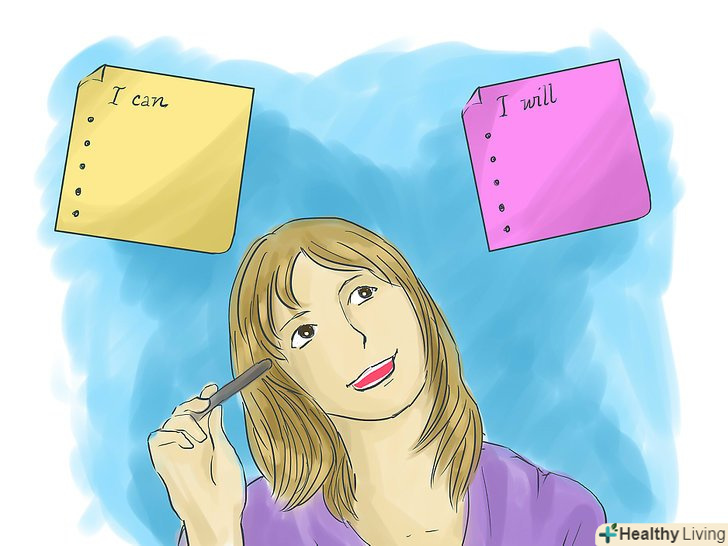 Запишіть свої афірмації.на початковому етапі Ви отримуєте хорошу практику, грунтуючись на позитивних якостях в теперішньому часі. Ви можете використовувати їх самі по собі як контр-установки або додати їх до інших афірмацій, щоб впливати на свою поведінку в майбутньому. Афірмації, які ви будете використовувати для впливу на майбутні зміни повинні слідувати тій же основній формі, яку Ви записали раніше. Знову ж таки, починайте з "Я", будьте коротким, ясним і позитивним. Є два види афірмацій, орієнтованих на майбутнє, які ви можете використовувати для просування до мети:- Твердження "я можу": напишіть пропозицію, яка підтверджує той факт, що ви можете досягти своєї мети. Наприклад, якщо ви хочете кинути палити, така заява як "я можу кинути палити" це гарний початок. Багато експертів рекомендують уникати будь-яких негативних постановок, тому краще сказати щось на кшталт "я можу звільнитися від куріння" або "я можу стати незалежним від сигарет".