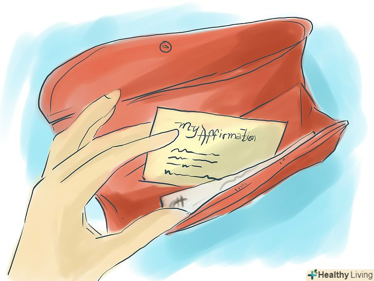 - Носіть свої афірмації з собою. Складіть список своїх афірмацій і покладіть його в гаманець або сумочку. Якщо вам потрібне натхнення або вам здається, що ви відхиляєтеся від шляху до своєї мети, дістаньте свої афірмації і прочитайте їх.