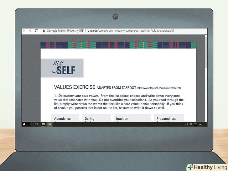 Використовуйте перелік цінностей, щоб вирішити, що для вас важливо.такий перелік складається зі списку цінностей, які можна проаналізувати. Обведіть в гурток або випишіть цінності, з якими ви себе ідентифікуєте. Потім виберіть 10 найголовніших цінностей в списку, щоб з'ясувати, що для вас найбільш важливо.[4]- Наприклад, можна використовувати цей перелік:http://www.grunin.org/info/articles/polezno/spisok-cennostej/