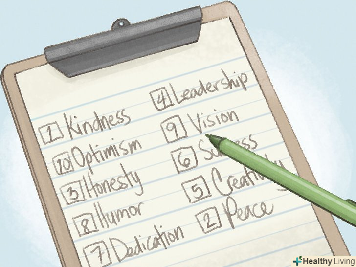 Складіть список речей, які найбільш важливі для вас в житті.навіть якщо ви не вважаєте це цінністю, швидше за все, є кілька речей, які відіграють для вас першорядне значення, наприклад сім'я і друзі. Витратьте 5-10 хвилин і подумайте, що ви вважаєте важливим у житті, а потім випишіть ці речі на листок паперу. Постарайтеся придумати хоча б 5 пунктів.[1]- Наприклад, можна написати « " Моя сім'я, творча сторона, допомога іншим, доброта до тварин і пізнання нових речей».