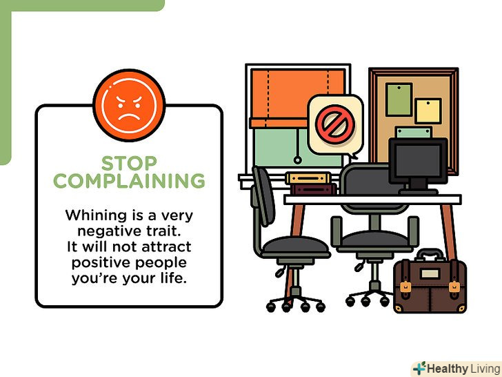 Припиніть скаржитися. Ниття — це надзвичайно негативна риса характеру. Цим ви ніколи не привернете в своє життя позитивних людей. Подумайте про все, в чому вам пощастило, і постарайтеся вибратися з незадоволеного стану. Якщо ви відчуваєте спонукання поскаржитися на щось, задумайтеся, чому це так сильно вас турбує, і постарайтеся побачити в будь-якій негативній ситуації можливість чогось навчитися. З цієї точки зору вам нема про що скаржитися, адже коли ви чогось вчитеся, ви ростете як особистість.[11]