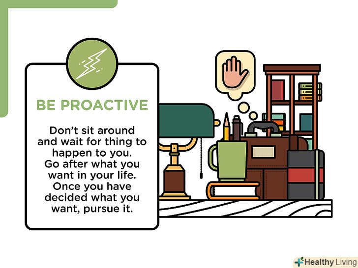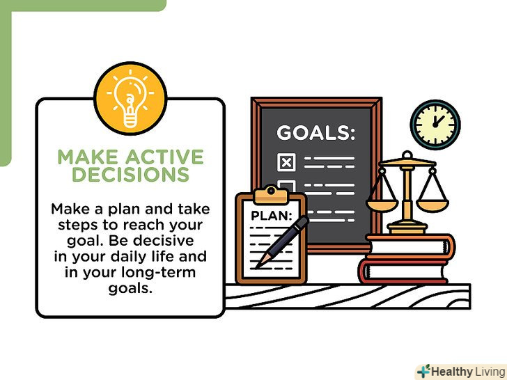 Активно приймайте рішення.задумайтеся над тим, чого ви хочете від свого життя, і прагнете до цього. Розробіть план і дотримуйтесь його крок за кроком. Сміливо приймайте рішення щодо свого повсякденного життя і довгострокових цілей. Не дозволяйте іншим змушувати вас приймати рішення проти вашого бажання і не в ваших інтересах.[14]- Якщо ви хочете вступити до Університету або змінити професію, ретельно це обміркуйте, зважте всі «ЗА» і «проти», а потім приймайте рішення. Сплануйте кроки, необхідні для реалізації задуманого, і втіліть бажані зміни в життя.