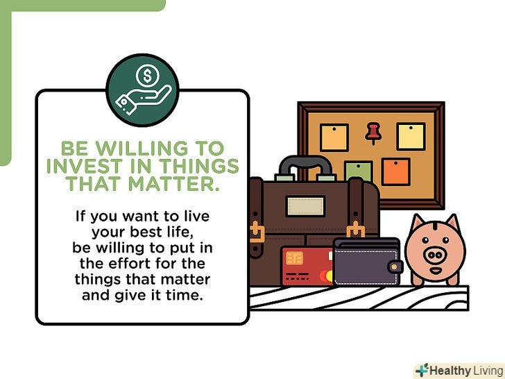 Будьте готові вкладатися в те, що по-справжньому має значення.більшість дійсно значущих речей вимагають часу. Неважливо, чи хочете ви створити благополучний шлюб або успішний бізнес, все це вимагає чималого часу. Якщо ви хочете прожити кращий варіант свого життя, будьте готові вкластися в те, що для вас дійсно значимо, і приділити цьому багато свого часу.[16]- Не розраховуйте на легкі шляхи вирішення. Якщо щось здається занадто легким або занадто хорошим, щоб бути правдою, можливо, так воно і є.