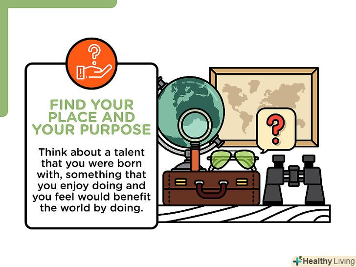 Шукайте своє місце і мету в житті.мабуть, це один з найскладніших кроків на шляху до кращого життя, і у багатьох на пошук мети і сенсу йде все життя. Багато так ніколи і не усвідомлюють своєї мети у всій повноті, але для того щоб прожити життя по максимуму, це просто необхідно. Подумайте про те, які таланти дісталися вам від народження, що вам особливо подобається робити і що може принести користь навколишнього вас світу.[3]- Ключ до набуття свого місця в світі полягає в тому, щоб бути відкритим до свого шляху і братися за різні справи — так ви зможете зрозуміти, чим саме вам подобається займатися. Нерідко цим може стати щось несподіване.