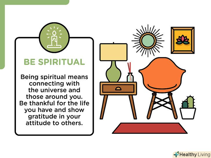 Розвивайте духовність.це зовсім не означає, що Вам обов'язково бути релігійною людиною. Духовна людина-це той, хто на своєму життєвому шляху шукає істину і зв'язок зі своїми витоками або Богом. Формування власної філософії-непростий шлях, але в довгостроковій перспективі він того вартий.[6]- Бути духовним означає усвідомлювати свій взаємозв'язок із Всесвітом і тим, що вас оточує. Будьте вдячні за те, що у вас є, і демонструйте цю подяку у відносинах з людьми. Ставтеся до інших людей з повагою і добротою. Цінуйте відносини, які у вас є, і красу навколишнього світу.