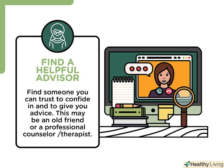 Знайдіть мудрого порадника. знайдіть того, кому ви зможете довіряти і довіритися. Це може бути старий друг або професійний психолог-консультант. Іноді приймати рішення буває неймовірно складно, і вам буде простіше розвивати навик прийняття зважених рішень, якщо поруч буде той, з ким можна проговорити всі виникаючі складнощі. Можливість поговорити з консультантом про важкі ситуації дозволить значно знизити рівень стресу і тривоги, а також знайти більше впевненості в своїх рішеннях.[7]- Консультант допоможе вам розвинути самосвідомість, яке, в свою чергу, дозволить вам більш якісно зосереджуватися на теперішньому моменті життя.
