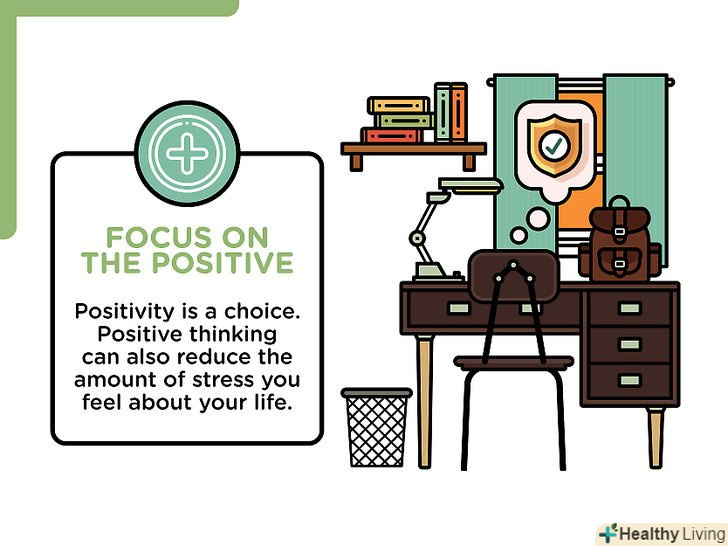 Зосередьтеся на позитиві.це ще один абсолютно необхідний крок, оскільки все в житті саме так, як ви це сприймаєте. Навіть найжахливіші ситуації можна побачити в позитивному світлі. Замість того, щоб думати «я знову стирчу в цій пробці», подумайте «у мене видалася хвилинка поміркувати над своїм життям — все одно я стою в пробці».- Позитивний настрій-це вибір. Виберіть бачити життя з яскравого боку і шукайте дорогоцінне в малому.