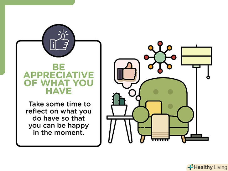 Цінуйте те, що маєте.якою б не була ваша життєва ситуація, у вас обов'язково є те, за що ви можете відчувати подяку. Якщо ви приймаєте людей і те, що вас оточує в житті, як належне, ви завжди будете шукати і хотіти більшого. Приділіть час тому, щоб поміркувати: що у вас вже є і що вже може зробити вас щасливим.[9]- Навіть якщо ви відчуваєте, що вам нема за що відчувати подяку, це неправда. Наприклад, якщо ви читаєте цю статтю, значить у вас є доступ до Інтернету і електрики (що для більшої частини цього світу є розкішшю), а також вільний час для того, щоб пошукати матеріал, який вам просто цікавий. За одне тільки це можна бути вдячним.