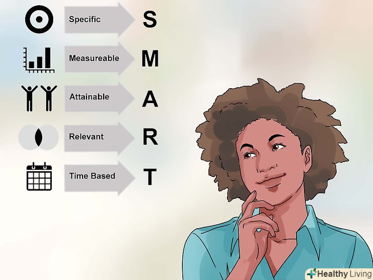 Продумайте цілі і йдіть до них. Дорослій людині потрібні цілі. Цілі надають життя сенс і змушують йти вперед. Коли людина досягає мети, у нього з'являється привід пишатися собою. Постановка цілей і робота над їх досягненням вимагає розставлення пріоритетів, як в особистому, так і в професійному житті.[7] якщо вам потрібно поставити перед собою мету, скористайтеся методикою S. M. A. R. T. ефективність цієї методики підтверджена науково. Відповідно до Методики S. M. A. R. T., мета повинна бути:[8]:- S-Specific, тобто конкретної. Звузьте ціль. Краще ставити перед собою не глобальні цілі з обтічним формулюванням, а конкретні цілі з чітким результатом.