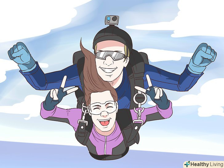 Розбийте заняття на невеликі кроки.якщо вибране вами завдання лякає або приголомшує вас, не робіть все відразу. Можна розбити процес на кілька кроків, які дозволять вам повільно «підкорювати вершину».[5]- Можливо, ви хочете стрибнути з парашутом, але вам страшно зробити крок з літака. Підніміться на вершину дуже високої будівлі і киньте погляд вниз. Потім спробуйте зайнятися менш масштабною діяльністю, яка включає в себе знаходження на висоті, наприклад парасейлінг або банджі-джампінг в парку розваг.