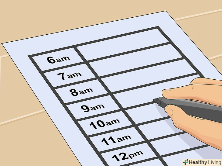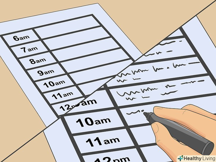 Створіть розклад на кожен день. ви ознайомилися з різними рекомендаціями з методу 1 і тепер готові використовувати повторні випробування, щоб оцінити ефективність рад. Для початку створіть таблицю або просто накресліть схему на папері. В одній колонці вкажіть години конкретного дня, а потім створіть більш широку колонку, залишивши місце праворуч від кожної години.[13]
