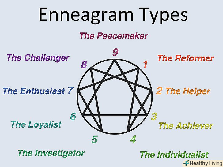 Еннеаграма особистості.така система класифікації типів особистості відносить людей до одного з дев'яти типів.[18] найчастіше людині підходить один найбільш виражений тип, хоча деякі характеристики можуть перетинатися.- Перегляньте свій список якостей, щоб спробувати віднести їх до одного з дев'яти типів такої концепції.