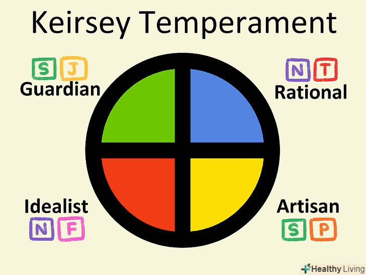 Класифікація темпераментів Кейрсі.ця система дозволяє віднести свою особистість до одного з чотирьох типів темпераменту: опікун, ремісник, ідеаліст або раціоналіст.[19] як і у випадку з типологією Майерс-Бріггс і великою п'ятіркою, ця класифікація досить широко досліджена.- Використовуйте свій список якостей, щоб віднести себе до одного з чотирьох темпераментів.