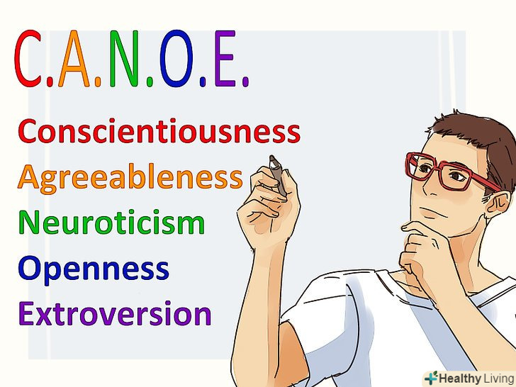 Опишіть свою особистість за допомогою методу Великої п'ятірки. цей популярний і всебічно досліджений метод класифікує особистості в контексті поєднання п'яти індивідуальних рис або диспозицій: сумлінності, доброзичливості, невротизму, відкритості до пізнання і екстраверсії.[6] ця система допоможе вам визначити свою особистість за допомогою термінів, які широко вивчені і зрозумілі багатьом людям.- Для кожної риси слід поставити "високий" або "низький" бал з урахуванням того, наскільки вона вам характерна.