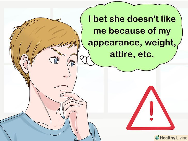 Помічайте помилкові висновки.помилкові висновки-це поспішні судження, в яких допущення далекі від реальності. Люди навіть не помічають, як часто вони вдаються до помилкових висновків.- Наприклад, якщо касир грубо відповідає вам, то можна припустити: «напевно їй не подобається мій зовнішній вигляд, вага або наряд», хоча в реальності ви не маєте поняття, про що зараз думає інша людина.[13]