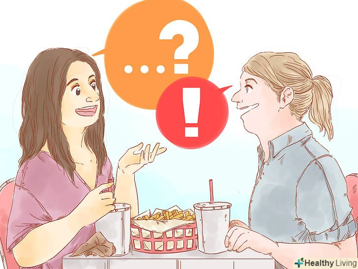 Будьте товариські.коли ви познайомитеся з ким-небудь, постарайтеся зосередитися на розмові. Це допоможе вам відкинути в сторону всі безперервні тривоги, які, ви, можливо, відчуваєте через свою вагу. Краще попрацюйте над своїми навичками спілкування з людьми і спробуйте поговорити з тим симпатичним хлопцем, якого побачили на вечірці.[10]- Будьте оптимістичні. Намагайтеся не обговорювати гнітючі або спірні теми при першому знайомстві з людиною.