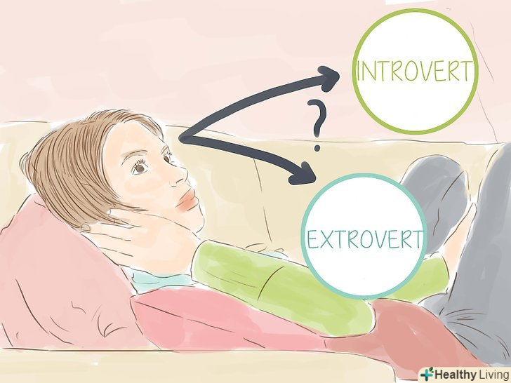 Інтроверти і екстраверти.якщо ви зважитеся пройти тест на визначення типу особистості, то одним з важливих факторів, які беруться до уваги, буде ваша інтроверсія або екстраверсія. Карл Юнг використовував дані терміни для опису напрямку, з якого людина черпає життєву енергію – з внутрішнього або зовнішнього світу.[8]- інтроверт - це людина, яка черпає енергію у вивченні внутрішнього світу думок, ідей, спогадів і реакцій. Такі люди насолоджуються самотністю і зазвичай вважають за краще проводити час з одним-двома близькими людьми. Вони можуть бути схильні до роздумів або замкнуті. екстраверт - це людина, яка черпає енергію у взаємодії із зовнішнім світом. Такі люди вважають за краще вести бурхливу діяльність і спілкуватися з усіма на світі. Вони найкраще почувають себе в компанії інших і можуть здійснювати необдумані вчинки.