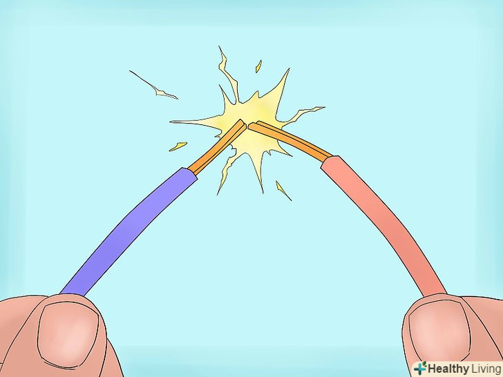 З граничною обережністю оголіть провід стартера приблизно на 1 сантиметр.він буде під струмом, тому вам потрібно бути дуже обережним і міцно тримати оголені дроти. Доторкніться кінцем цього дроту до з'єднаних проводів батареї. Не намагайтеся прикрутити його, щоб завести машину, — просто створіть їм іскри об дроти батареї.
