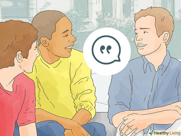 Користуйтеся звичною для вас лексикою.як ви зазвичай говорите з самим собою? Подібним чином ви повинні розмовляти з іншими людьми. Не мовчіть в присутності інших людей і намагайтеся говорити розумні і цікаві думки. Використовуйте слова, які вам подобаються, замість популярних сленгових фраз, які вам не до душі. Крім того, не вживайте довгі слова, значення яких ви не розумієте.[9]- Якщо вам подобається використовувати сленг або виразні мовні конструкції, ви можете це робити. Просто переконайтеся, що Ви так завжди говорите в звичайному житті, а не просто намагаєтеся комусь наслідувати.