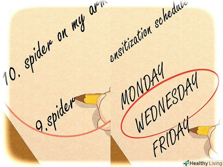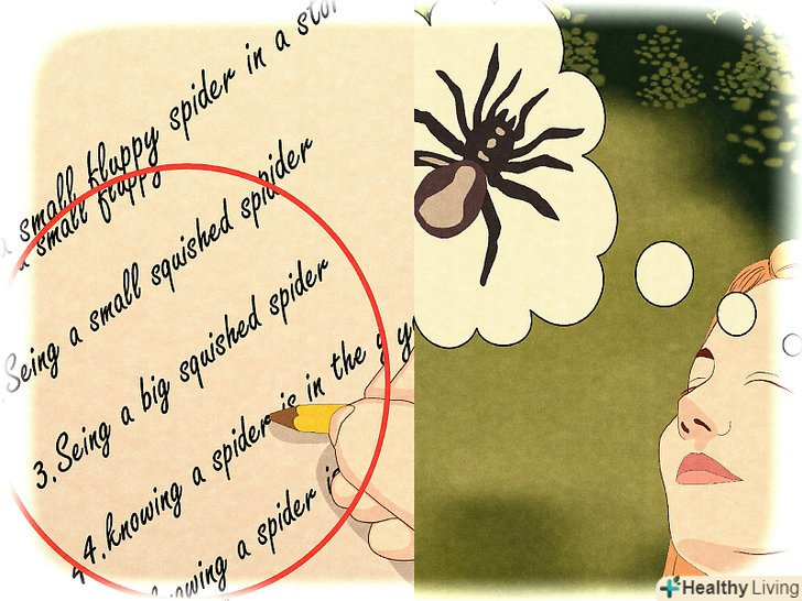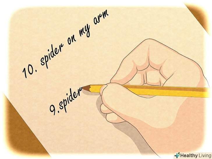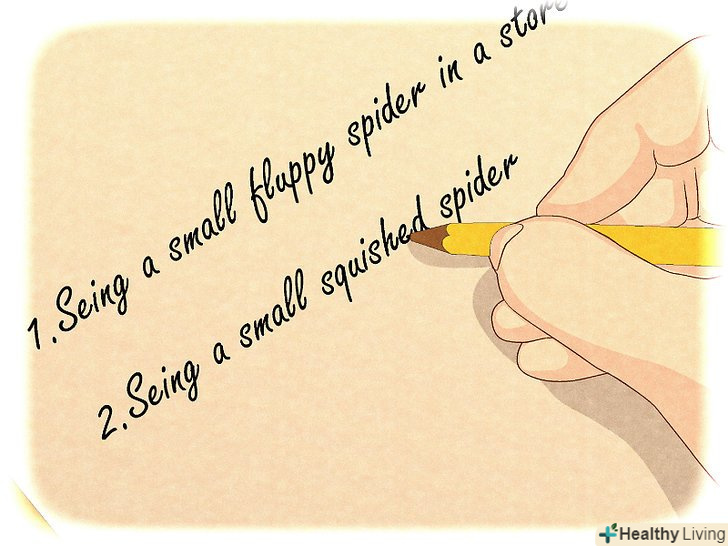 Складіть список страшних ситуацій, що мають відношення до вашої фобії.для початку проставте на листку цифри, починаючи з 10 і до 1. Уявіть найстрашніший випадок (в реальному світі), в якому ви можете опинитися, і запишіть його поруч з цифрою 10. Рухайтеся до 1, записуючи все менш і менш страшні ситуації. Наприклад, якщо у вас боязнь павуків, ваш список може бути наступним: