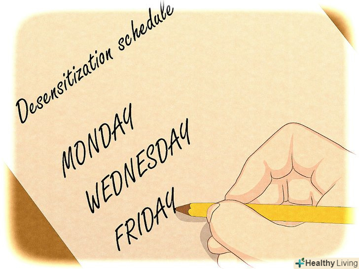 Складіть графік десенбілізації.щотижня, у встановлений час, ви повинні представляти все більш страшні випадки, одночасно виконуючи техніку релаксації. Не поспішайте і обов'язково відновіть свої психічні сили, перш ніж перейти до наступного кроку.- Деякі вважають за краще займатися десенбілізацією раз в два дні і не чекати цілий тиждень. Спробуйте обидва методи і вирішите, що вам більше підходить. Все залежить від ступеня випробовується після кожного сеансу занепокоєння. Якщо ви відчуваєте сильну тривогу, тоді перерва між сеансами краще зробити довше.