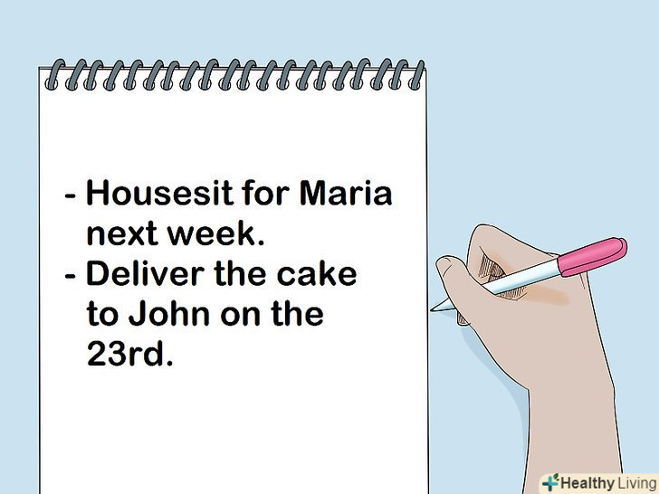 Записуйте свої обіцянки в щоденник.якщо ваше життя насичене подіями, легко забути або втратити рахунок своїм зобов'язанням і обіцянками. Якщо ви дали слово, запишіть обіцянку в блокнот. Виділіть час, щоб все зробити. Використовуйте один загальний щоденник, календар або додаток для всіх своїх зобов'язань, щоб мати чітке уявлення про те, що вам належить зробити в певний день.[8]- Наприклад, можна написати:" доглянути за племінницею на наступному тижні "або»спекти пиріг для Вані на п'ятницю".