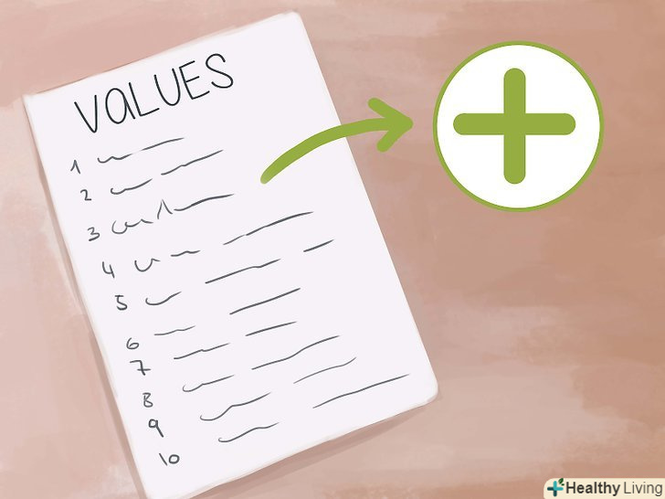 Визначте свої цінності.важливо зрозуміти свої цінності, щоб діяти відповідно до пріоритетів. Хто і що мають для вас найбільше значення? Свобода, радість, рівність, гроші, сім'я? Складіть список своїх цінностей хоча б з 10 пунктів (бажано в порядку убування важливості).[3]- Подумайте, як ваші нинішні дії відповідають таким цінностям і як цінності впливають на ваше життя. Можна уявити, що подумав би про ваші цінності така людина, яку ви поважаєте. Наскільки б вони змінилися після подібної оцінки?