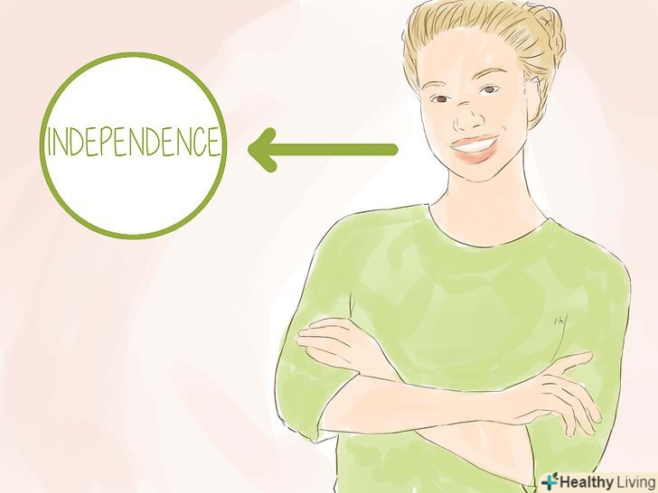 Прагніть до незалежності.якщо ваше емоційне здоров'я, спосіб життя або поведінка залежать від інших, то ви не контролюєте своє життя. Вчіться вирішувати свої проблеми і проводите час на самоті, щоб думати і міркувати. Звертайтеся за допомогою тільки в разі реальної необхідності і вчіться у тих, хто вам допомагає, щоб потім ви могли допомогти собі самостійно.[14]- Вчіться задовольняти свої потреби. Знайдіть роботу і почніть утримувати себе, якщо ви живете за чужий рахунок. Спробуйте знайти квартиру, щоб не жити з батьками.