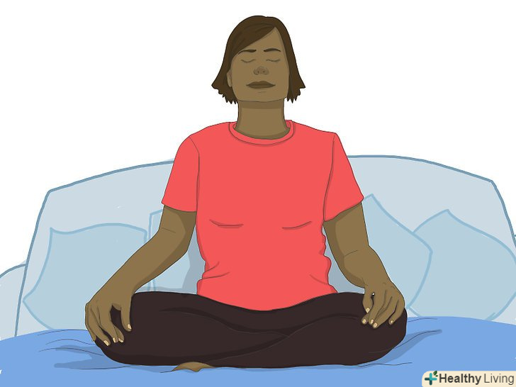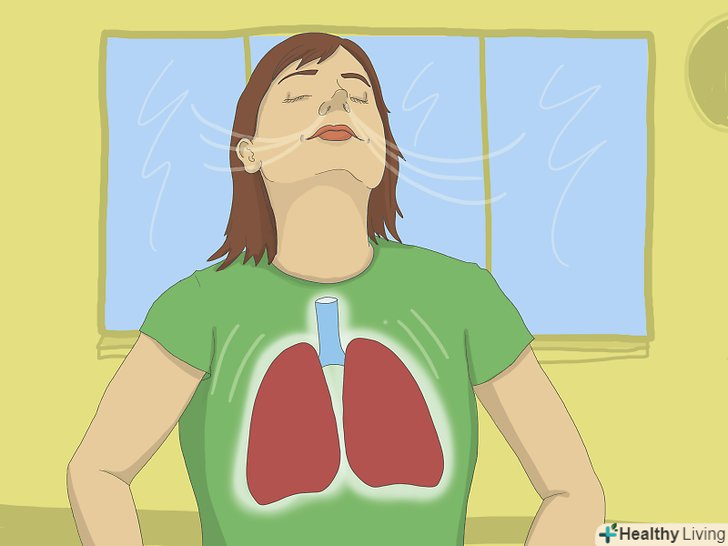 Дихайте глибоко.коли очі закриються, зробіть глибокий вдих через ніс і затримайте дихання на 10 секунд. Потім видихніть через злегка прочинені губи, щоб звук видиху був схожий на гуркіт океану.[5]- Під час вдихів і видихів не заважайте вашій голові опускатися в напрямку грудної клітини і відчуйте хвилю тепла і тяжкості, яка рухається від верху голови до кінчиків пальців на ногах. Дихайте рівно і не поспішаючи. При кожному видиху говорите слово"спокій".