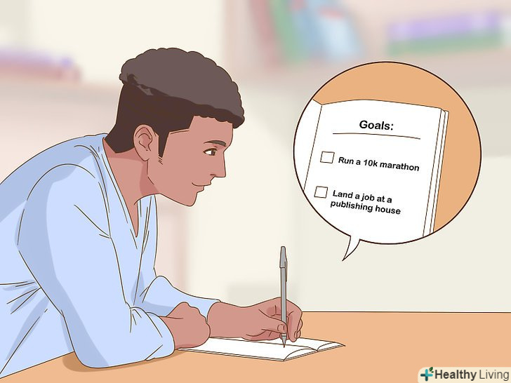 Ставте цілі.плани часто і швидко змінюються, але у вас повинні бути довгограючі цілі. Потрібно щосили працювати над досягненням цих цілей, незважаючи на інші події, що відбуваються в житті.- Складіть список цілей в порядку від найбільш важливих до найменш важливих. Цілі можуть бути наступними: взяти участь у марафонському забігу, влаштуватися на роботу у видавництві, зробити клаптикову ковдру з сузір'ями для великого двоспального ліжка.