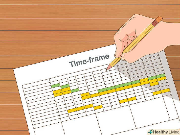 Встановлюйте часові рамки.необхідно мати не тільки чітко викладені плани по досягненню цілей, але також і тимчасові рамки їх досягнення. Безсумнівно, терміни і цілі можуть змінюватися, багато що може змінюватися. Але наочний часовий межа допоможе вам зібратися і зосередитися на завданні.- Приклад: для участі в марафонському забігу необхідно вибрати відповідний час і місце. Потрібно призначити тимчасові рамки для підготовки. Як швидко і на яку відстань Ви повинні вміти бігати? Коли? Ви вже готові до марафону? Вже записалися? Поступово викреслюючи по одному пункту зі свого списку, ви будете наближатися до вашої мети.