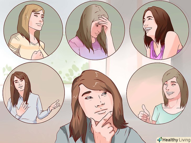 Подумайте, чи є ваша самооцінка здоровою. Людина зі здоровою самооцінкою вважає, що він має вагу в суспільстві і гідність. Людина з низькою самооцінкою не впевнений в собі і постійно шукає схвалення і визнання оточуючих. Якщо вас постійно відвідують негативні думки, у вас може бути занижена самооцінка. Низька самооцінка негативно впливає на сприйняття себе, тому вкрай важливо проводити свідому роботу над ставленням до себе. Якщо ви не впевнені, чи можна вважати вашу самооцінку заниженою, подумайте, чи знайомі вам три "особи" низької самооцінки:[4]- Жертва. Людина відчуває себе безпорадним і чекає, що йому хто-небудь допоможе. Страх невдач він ховає під жалістю або байдужістю до себе. Людина не впевнений в собі, не проявляє всіх своїх талантів, а його самооцінка сильно залежить від думки інших.
