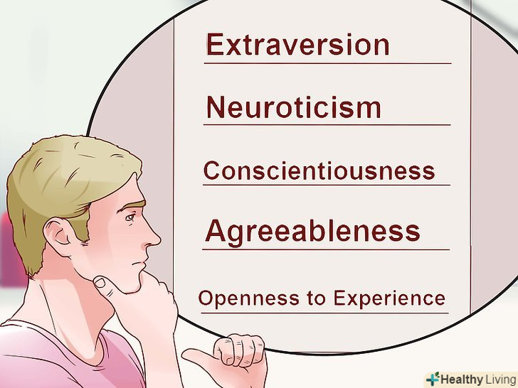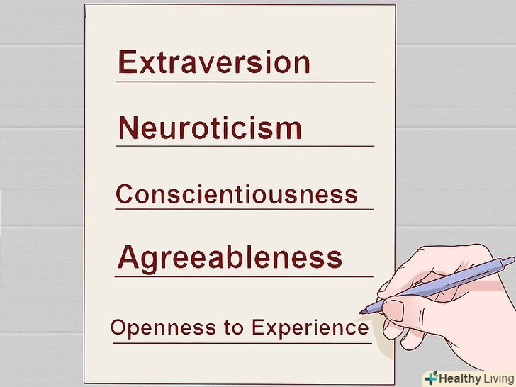 Назвіть колонки. напишіть вгорі колонок "екстраверсія", "емоційність", "сумлінність", "доброзичливість"і " відкритість". Ці терміни описують п'ять ключових факторів особистості, які також називаються великою п'ятіркою. Більшість дослідників сходяться в тому, що ці п'ять факторів характеризують особистість і вкрай важливі в будь-яких міжособистісних взаємодіях.[5]- Пам'ятайте, що ці риси не описують типи особистості, а дозволяють оцінити ступінь розвиненості певних якостей в людині. Наприклад, у однієї людини може бути багато доброзичливості, але мало екстраверсії (товариськості). Така людина не буде товариським, проте ставитися до оточуючих він буде добре.