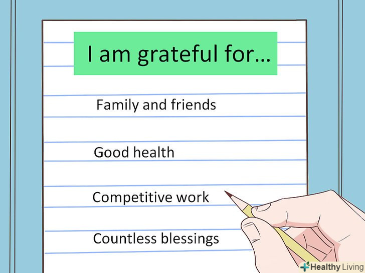 Виховуйте в собі подяку.вдячність-це вдячність за все те хороше, що є в цьому світі, крім нас самих. Вдячність добре впливає на фізичне і психічне здоров'я, а також може налагодити ваші відносини, що все разом поліпшить ваше ставлення до життя. Щоб виховувати в собі подяку, можна:[20]- Вести щоденник і записувати кожен день кілька речей, за які ви вдячні.