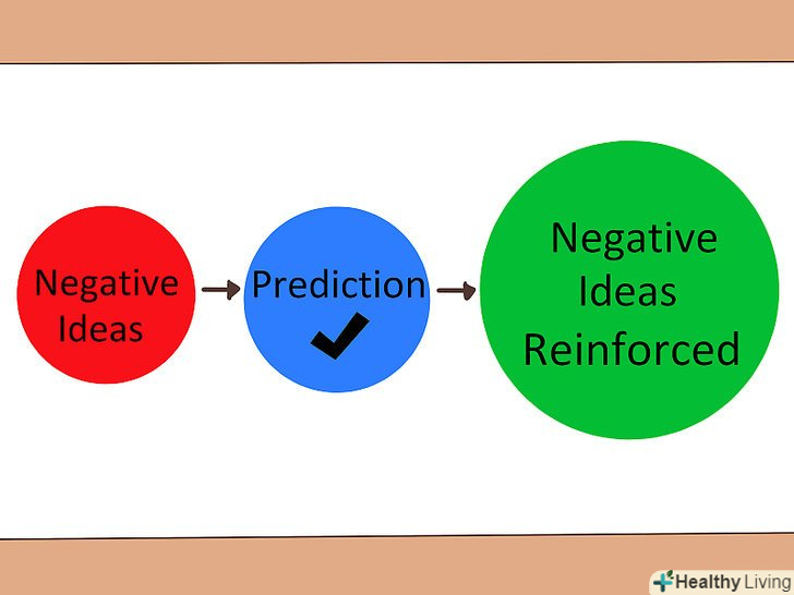 Розгляньте свої ідеї про світ.ваші негативні думки про світ змушують вас діяти певним чином і це може визначати результат деяких ситуацій. Ваші негативні думки можуть навіть приймати форму передбачень і кожен раз, коли одне з таких передбачень збувається, ваші негативні погляди ще більше зміцнюються. Це ще називають самонавіюваним пророкуванням.- Прикладом такого самонавіюваного передбачення може бути ситуація, коли ви вважаєте світ холодним і жорстоким місцем, тому ви холодно і жорстоко поводитеся з людьми. В результаті, люди у відповідь до вас теж ставляться холодно і жорстоко. Потім ви трактуєте їх вчинки як такі, що збігаються з вашим баченням світу, що ще більше зміцнює ваше ставлення.[2]
