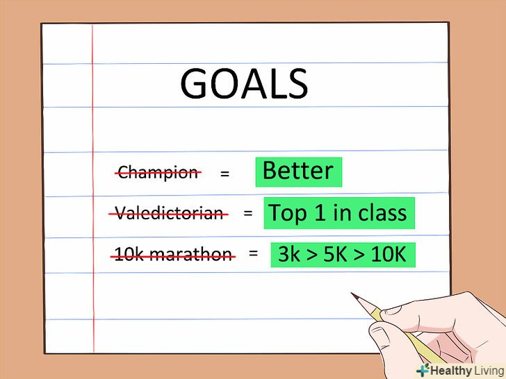 Ставте перед собою розумні цілі.ставити недосяжні цілі-вірний спосіб посилити своє негативне ставлення до світу; що все занадто складно, нечесно, що ви завжди пливете проти течії тощо. Постановка таких практично нездійсненних цілей також геть вбиває мотивацію.[6]- Замість того щоб ставити собі мету "я збираюся отримати "відмінно" з усіх предметів в цьому семестрі", краще сформулюйте мету таким чином: "я збираюся зробити все можливе, щоб добре встигати на заняттях"; або, замість того щоб зробити собі установку стати відомим музикантом, можна вирішити регулярно займатися музикою.