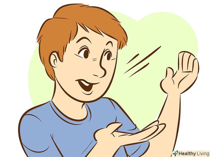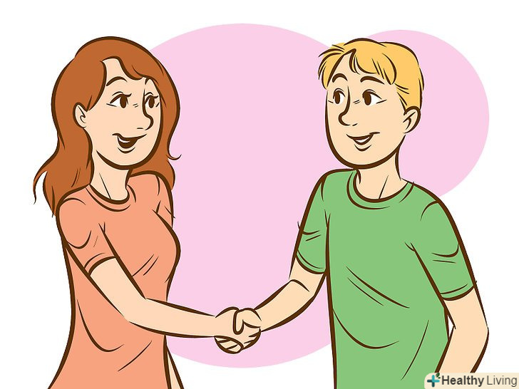 Встановіть зоровий контакт з людиною і потисніть йому руку.ваша поведінка і мова тіла не менш важливі, ніж ваші слова. Зоровий контакт вкрай важливий при знайомстві з людьми. Дивіться людині в очі впевнено, коли ви простягаєте йому руку. Міцно (але не дуже сильно) потисніть людині руку. Рукостискання-основа вашої розмови.- Намагайтеся не дивитися вниз і по сторонах, так як інші можуть подумати, що вам не дуже цікаво спілкуватися з ними.