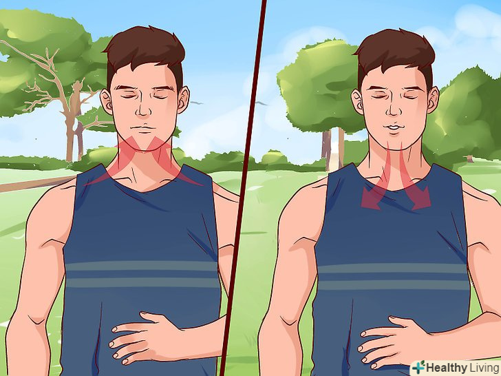Використовуйте черевне дихання.якщо у вас починається напад паніки або виникла напруга шийних і грудних м'язів, то почніть глибоко дихати. Повільно вдихайте через ніс і прагніть до того, щоб повітря досягло самої нижньої частини легенів. Затримайте дихання на секунду, коли ваш живіт збільшиться в об'ємі. Повільно видихніть і розслабте все тіло.[2]- Повторіть цей процес до 10 разів. Виконуйте зворотний відлік від 10 на кожен видих. Можна виконати три підходи по 10 разів.