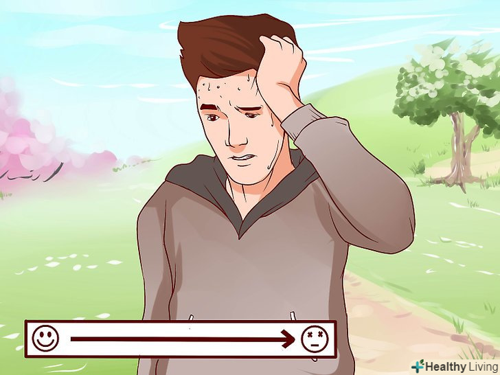 Створіть шкалу тривоги.вивчіть свої рівні тривожності, щоб приймати необхідні дії до початку повномасштабних нападів паніки. Також шкала тривожності підкаже, коли потрібно припинити терапевтичний вплив, щоб не допускати помірної паніки. Така шкала повинна включати фізичні та психічні характеристики занепокоєння. Як приклад можна використовувати таку шкалу:[5]- 0-ви повністю розслаблені: спокій, відсутність напруги, умиротворення;