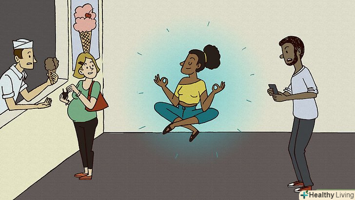 Як тільки почнете відчувати дратівливість, спробуйте коротку медитацію.спробуйте подивитися на це почуття, як на можливість зосередитися на своєму диханні і побути наодинці з собою. Встаньте прямо або сядьте в крісло і глибоко дихайте, звертаючи увагу на темп вдихів і видихів. Закрийте очі, якщо є можливість (або сфокусуйтеся на нерухомій точці в кімнаті).[8]- Займайтеся такими короткими сеансами медитації кілька разів на день, навіть якщо не відчуваєте дратівливості і злості. Розслаблення, яке приходить під час медитації, допоможе вам реагувати спокійніше, коли настане неприємна ситуація.